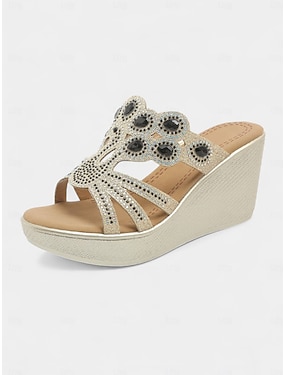 kvinners boho gull rhinestone kile-sandaler – glitrende slip-on plattformhæler for strandferier, sommerfester og resortklær