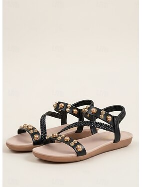 hvite flettede sandaler for kvinner med imiterte perlestifter og komfortabel såle – stilig sommerfottøy for fritidsklær og strandutflukter