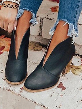 svarte ankelstøvletter for kvinner – trendy slip-on-støvletter i v-snitt med tykke blokkhæler for uformelle antrekk og høstantrekk