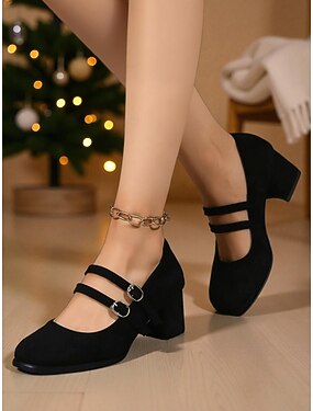 Røde damesko fra 1950-tallet med Mary Jane-motiv og doble stropper – komfortable blokkhæler til jul, høytidsfester og kontorantrekk