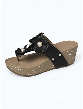 Grønne kilehælsandaler med blomsterapplikasjoner til dame – komfortable sommersandaler med platåpynt og imiterte perler til hverdagsbruk, hagefest og fritidsbruk