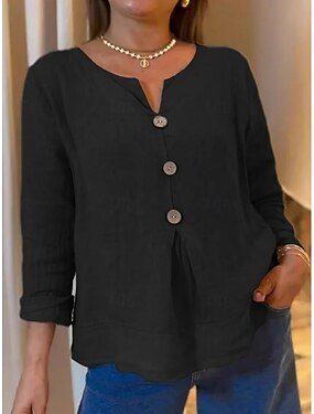 Dame Sommerskjorte Skjorte i bomullslin Bluse Knapper Helfarge Elegant Fritid Langermet V-hals Vanlige topper Daglig Ferie Blå Svart Rosa Lilla Grønn Sommer Vår Høst
