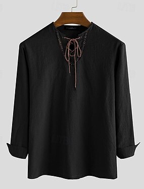 Herre Skjorte Linskjorte Viking stil Sommerskjorte Strand Klær Helfarge Feriereise Gate Svart Hvit Navyblå Blå Langermet Henley Sommer Vår Klær Lomme