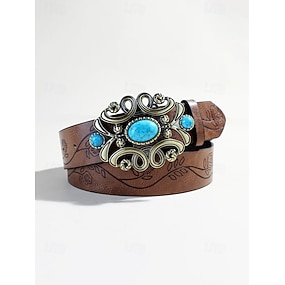 Damebelte i bohemsk kunstskinn med turkis mønster, svart og brunt western vintage-midjebelte med gravert stropp og utsmykket spenne for fritidsbruk, reise, ferie og resort-styling.