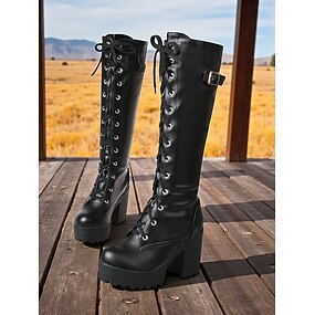 Hvite platåsko med snøring, knelange støvletter til dame, blokkhæl og spenne – retro motesko til fest, cosplay og kveld ute
