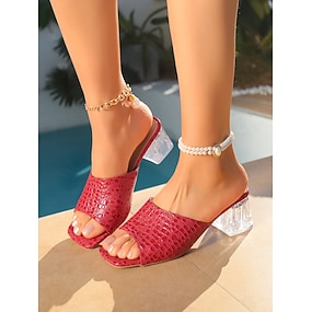 Røde dameslippers med krokodillemønster og klare blokkhæler – dristig resortstil, komfortable sandaler med åpen tå for sommerferier og avslapning ved bassengkanten