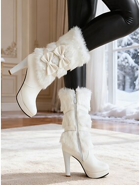 Hvite damestøvletter i fuskepels med høy hæl og sløyfedetaljer – elegante vintersko med glidelåslukking, elegante for formelle anledninger og høytidsdager