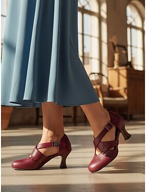 Damesko i burgunderfarget skinn fra 1950-tallet – elegante Mary Jane-hæler med justerbar spenne for formelle arrangementer, fester og hverdagsbruk