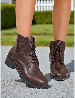 Brune ankelstøvletter med snøring til dame, utendørssko i imitert skinn til jobb, hverdagsbruk og høstantrekk