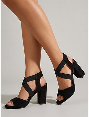 Svarte damesandaler i semsket skinn med hæl – komfortable blokkhælsko med elastiske stropper i kryss for kontorbruk, forretningsmøter og komfort hele dagen