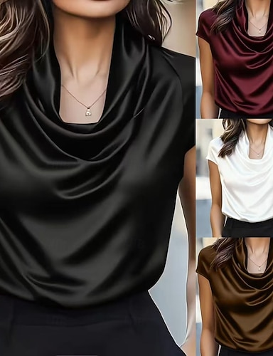 Dame Bluse Rynket Helfarge Elegant Stilfull Fritid Kortermet Cowl-hals Vanlige topper Daglig Svart Hvit Vin Brun Sommer Vår