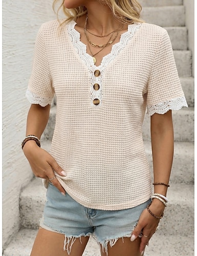 Dame Bluse Blonde Lapper Knapper Helfarge Stilfull Fritid Kortermet V-hals Vanlige topper Daglig Aprikos Sommer Vår