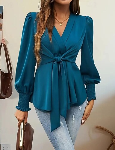Dame Bluse Drapering عادي Elegant Stilfull Langermet V-hals Vanlige topper Ferie Ut på byen Svart Rosa Navyblå Himmelblå Sommer Vår Høst