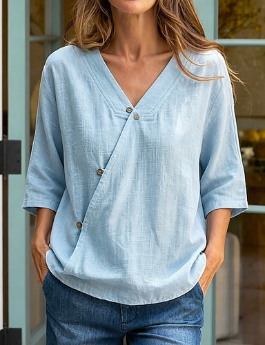 Dame Skjorte Skjorter i bomullslin Sommerskjorte Uformell skjorte Knapper Helfarge عادي Ferie Mote Fritid Halvlange ermer V-hals Vanlige topper Gateklær Strand Ferie Blå Sommer Vår Høst