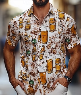 Herre Oktoberfest øl Skjorte Sommerskjorte Skjorte med knapper Kortermet Hawaiisk utendørs Ferie Sommer Vår Aftæpning 3D-utskrift krage skjorter Aprikos