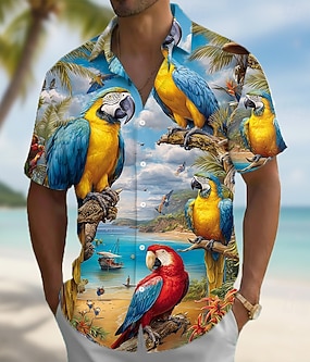 Herre Fugl Papegøye Tropiske planter Hawaii skjorte Skjorte med knapper Aloha skjorte Kortermet Morsom Feriereise Strand Klær Sommer Vår Aftæpning 3D-utskrift krage skjorter Blå