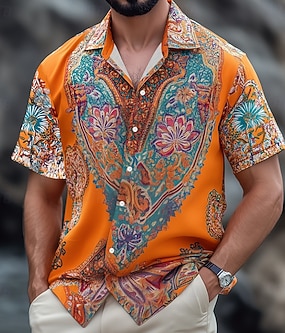 Herre Blomstermønster Indiske kostymer Bohem Skjorte Hawaii skjorte Skjorte med knapper Kortermet Hawaiisk Feriereise Ferie Strand Klær Sommer Vår Aftæpning 3D-utskrift krage skjorter Blå Oransje