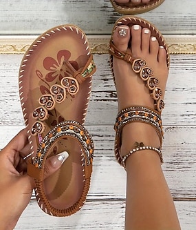 bohemperlesandaler for kvinner - håndlagde flate sandaler med blomsterpynte for sommerstrand og fritidsklær