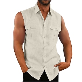 Herre Skjorte i bomullslin Sommerskjorte Uformell skjorte Strandskjorte Ensfarget / vanlig farge Hawaiisk Svart Blå Lilla Grønn Ermeløs Skjortekrage Sommer Klær
