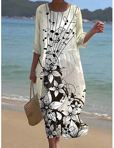 Dame midikjole i linlignende pustende lettvekt sommerkjole skiftkjole A-line kjole ferie uformell boho strand utendørs blomstermotiv 3/4 lengde ermer rund hals blå rosa svart-hvitt sommer vår