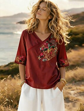 Dame Bluse Imitert bomullslin Broderi Trykt mønster Blomstret Aktiv Årgang Halvlange ermer V-hals Vanlige topper Daglig Ferie Ut på byen Svart Hvit Vin Grønn Sommer Vår
