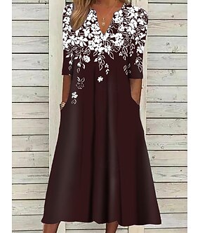 Kjolen Midi Tunika Kjole Blomster Lommer V-Hals Midi Kjole Elegant Stilfull Daglig Halv Erme Sommer Vår