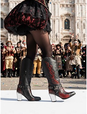 Damesko med flammebroderi i westernstil - kraftige støvler i svart og brunt, gotisk materiale med mellomhøye hæler til halloween, musikkfestivaler og rodeoantrekk