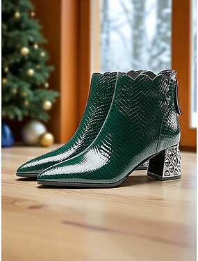 Grønne damestøvletter i lakkskinn med slangeskinnstekstur og blokkhæl i strass, trendy motestøvler for kvelder ute og fester &hverdagsantrekk