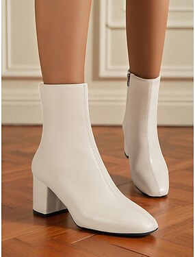 Hvite ankelstøvletter i imitert skinn til dame – moteriktige støvletter med blokkhæl og glidelås på siden for hverdagsbruk, jobb og fritidsklær