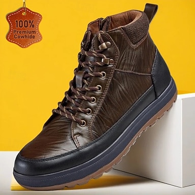herresko i brunt skinn med høy topp og robust såle – uformelt fottøy for utendørseventyr, fotturer og helgeturer