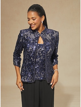 Dame Bluse Dressy topper Tvillingsett Paljetter Blonde Paisly Elegant Fest 3/4 ermer Kinesisk Krave Semi-formelt Formell klær Cocktail antrekk Navyblå Vår Høst Vinter