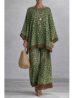 Dame Skjorte Linsett i bomull Buksesett Langermet Klokke Rund hals Grafisk Batikkfarget Trykt mønster Ferie Mote Gatemote Avslappet Daglig utendørs Kamel Lilla Grønn Sommer Løstsittende