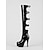 Svarte damestøvletter i kunstskinn med platå over kneet, kjeder og spenner – sexy støvletter i punkstil med stiletthæl for sceneopptredener, kvelder ute og edgy hverdagsmote