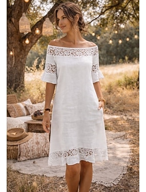 Dame Midikjole 100% قطن Skiftkjole Solkjole Uformell kjole Mote Moderne Fritid Daglig utendørs Feriereise Normal عادي Kortermet Løse skuldre Hvit Sommer Vår