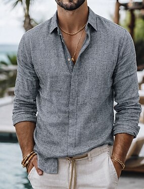 Herre Skjorte linskjorte Sommerskjorte Helfarge Gate Dagligdagstøy Hvit Navyblå Grønn Beige Langermet Klær