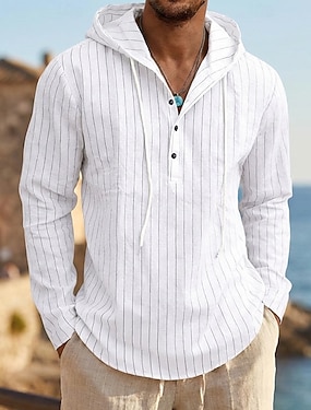 Herre Skjorte Linskjorte Sommerskjorte Strand Klær Skjorte med hette Stripete skjorter Vertikale striper Avslappet Feriereise Svart Hvit Navyblå Grønn Langermet Hettegenser Sommer Vår Klær
