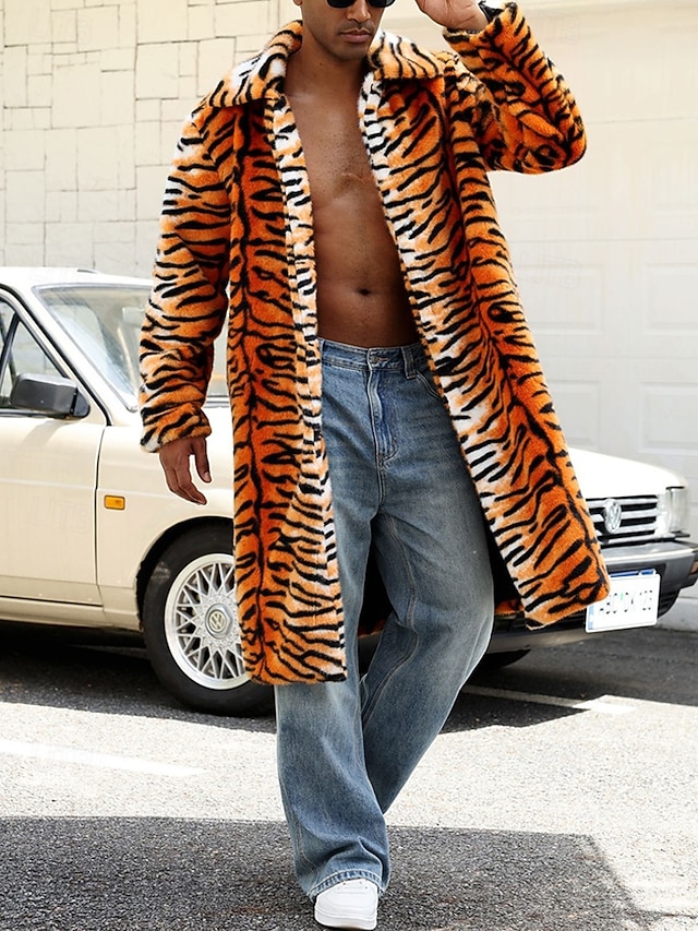Kjønn:Herre,Yttertøy Type:Vinterjakke,Fuskepels,Anledning:Feriereise,Daglig,Ut på byen,Årstid:Vinter,Høst,Funksjon:Hold Varm,Stoff:Fuskepels,Stil:Fritid,Mote,Gatemote,Lengde på ytterklær:Lang,Mønster:Tigerpels,Design:Fleece,Halslinje:Knaphul,Ermelengde:Langermet,