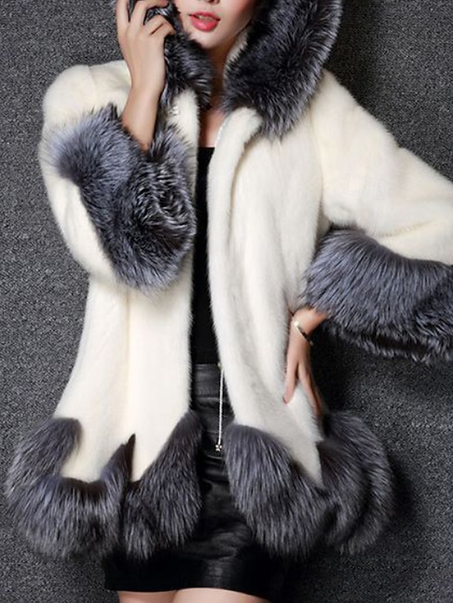 Dame Fuskepels Hold Varm Bekvem Lapper Lomme Knapper Pelskrage Mote Fargeblokk utendørs Feriereise Ferie Ut på byen Lang Med hette Normal Langermet Yttertøy Svart Hvit Høst Vinter #11967821