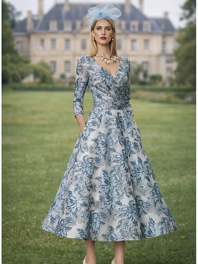 A-linje Ankellengde Te-lengde Formell kjole Cocktailkjoler Elegant 3/4 ermer V-hals Bryllup Formell Sateng Jacquard med Dusk