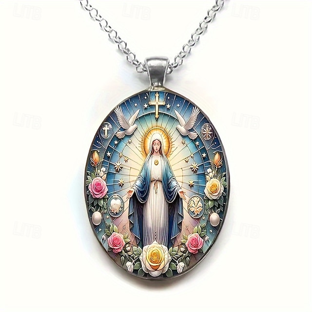 Jomfru Maria katolsk anhengskjede, religiøs kristen medalje med duer, kors og roser, åndelig smykkegave til kvinner#13165269