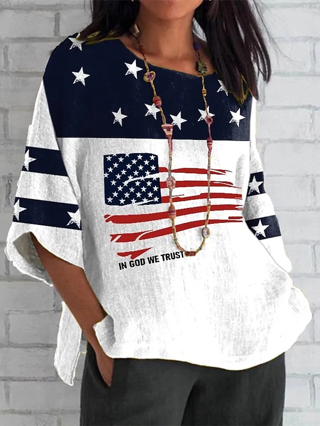 Uavhengighetsdagen Patriotiske Kvinne Bluse Lin Lignende Grafisk Flagg Bohemia Vintage Tropisk 3/4 Lengde Ermer Rund Hals Vanlige Topper Daglig Ferie Ferie Slitasje Trykk Rød Blå Grå Sommer Vår#14347567