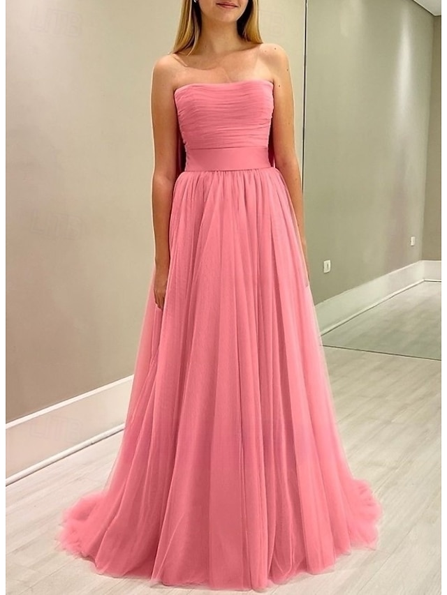A-linje Gulvlengde Ballkjoler Elegant Ermeløs Stroppeløs Bryllupsgjest Engasjement Tyll med Sløyfe(r) Plissert Bølgemønster #14522949