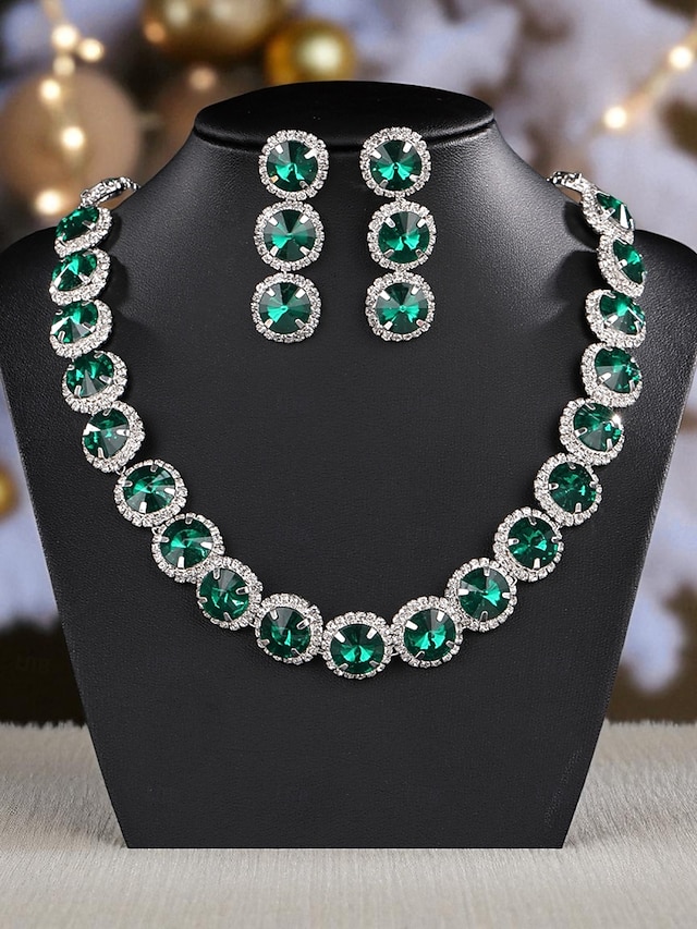 Smaragdgrønt smykkesett med strass til julebord for dame, elegant krystallkjede og øredobber til formelle kvelder &høytidsfeiringer#14757418