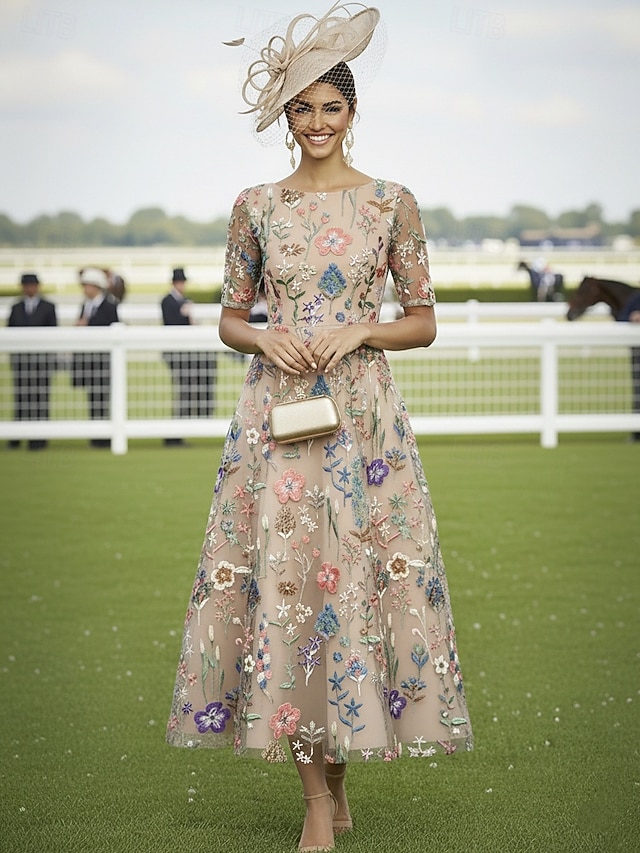 A-linje Ankellengde Te-lengde Cocktailkjoler Elegant Blomster Kortermet Båthals Bryllup Formell Blonder med Broderi Appliqué