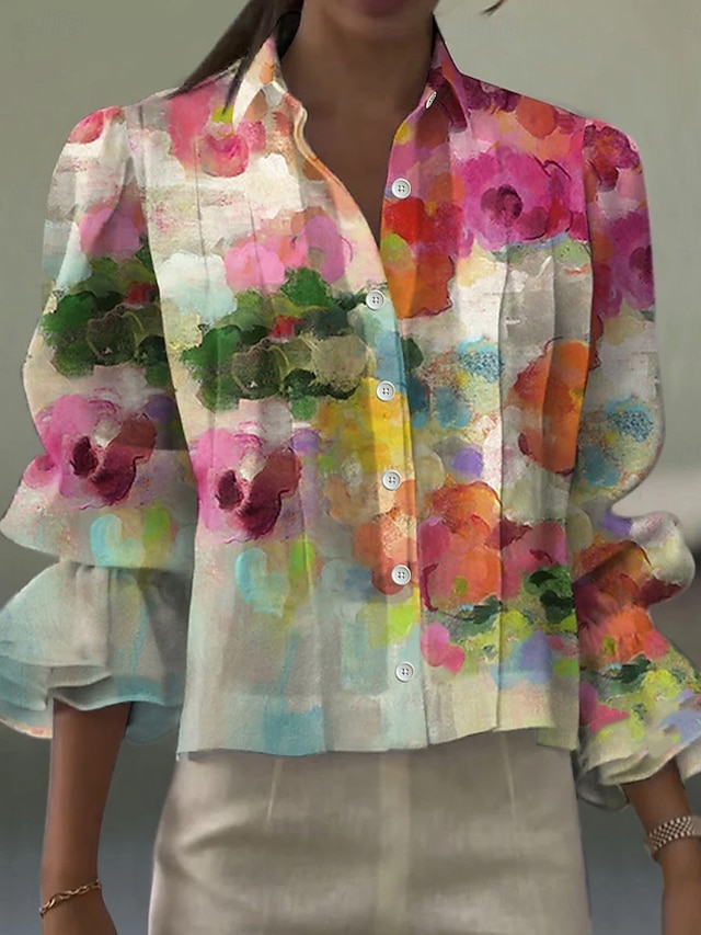 Damer Skjorte Linlignende Pustende Lettvekts Blomster Grafisk Elegant Bohemia Vintage Langermet Vanlige Topper Daglig Arbeid Ferie Volanger Rosa Sommer Vår#18675945