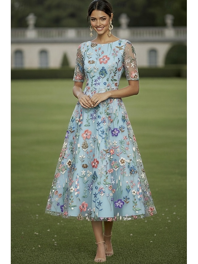 A-linje Kjoler Te-lengde Cocktail Kjole Gjestekjole til bryllup Kjole til brudens mor Halvlange ermer Crew-hals Elegant Fritid Formell Bryllupsgjest Kentucky Derby Chiffon Tyll med Blomstertrykk