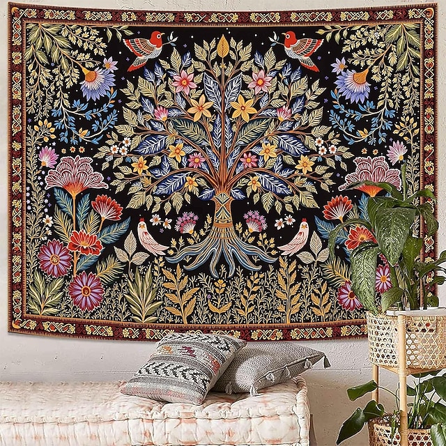 Livets tre folkekunst veggteppe bohemsk etnisk fugler og blomster natur landskap svart bakgrunn åndelig hjemdekor stue soverom bakgrunn innendørs veggmaleri #19851614