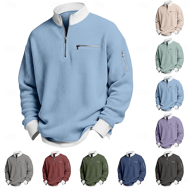 Herre Vaffel T-skjorte T skjorte Langermet Halv glidelås Vår Høst vinter Helfarge Tradisjonell / vintage Fritid Fargeblokk Lomme med glidelås utendørs Hjem Sport & Utendørs Lyseblå Rød Lilla Topp#9878457