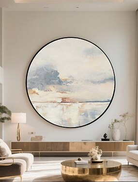 håndlaget sirkulært oljemaleri abstrakt hav sjølandskap myke skyer tåkete himmel refleksjon teksturert 3D penselstrøk blå hvit grå terrakotta moderne veggkunst klar til oppheng inkludert innerramme