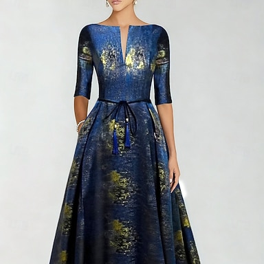 A-linje Gulvlengde Gjestekjole til bryllup Formell kjole Kjole med vidt skjørt Kjole til brudens mor 3/4 ermer Dronning Anne Elegant Høy splittelse Formell Sateng med Sløyfe(r)
